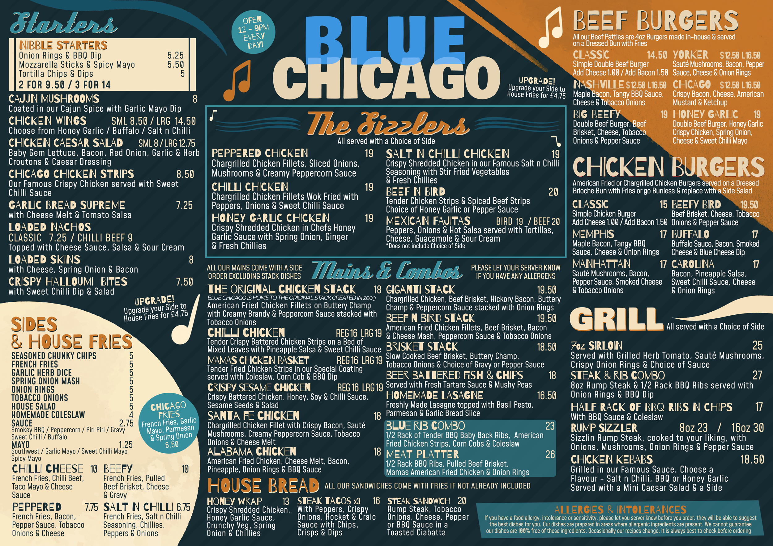 Blue Chicago Grill offers an extensive all day menu of delicious simple traditional food with an American Influence, cooked well and transformed into memorable classics and using fresh local produce. Famous for our char grilled steaks, tender BBQ ribs, classic American chicken dishes and amazing desserts.